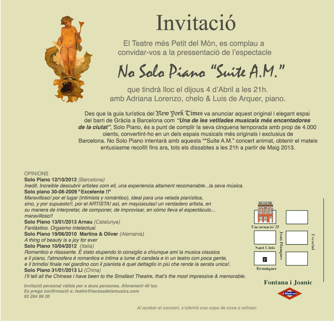 Us enviem una invitació «*EXPRESS» vàlida per a dues persones per a la presentació de No Solo Piano de demà dijous 4 d’abril a les 21h.