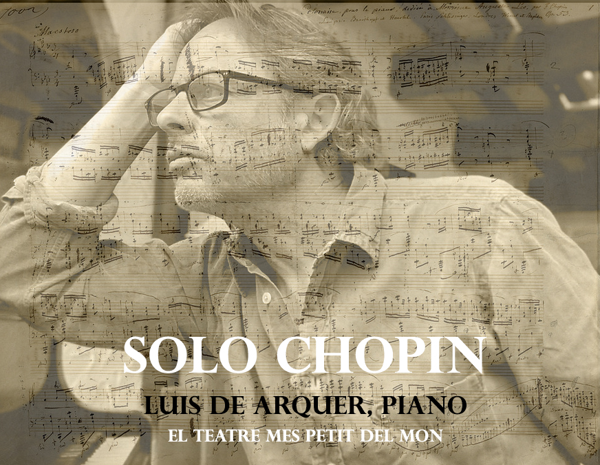 «Solo Chopin es un recital de piano presentado por el talentoso Luis de Arquer, quien rinde homenaje al famoso compositor Frédéric Chopin. En esta velada, el público puede disfrutar de algunas de las piezas más emotivas y románticas de Chopin, que siguen tocando corazones a pesar del paso del tiempo. La actuación tiene lugar en un pequeño teatro lleno de una atmósfera íntima y llena de historia, donde al propio Chopin le habria encantado tocar. La noche culmina con una copa de cava en un jardín romántico iluminado con velas. La Guía turística de El New York Times ha destacado que » Esta podría ser una de las experiencias musicales más encantadoras que se pueden vivir en Barcelona.»